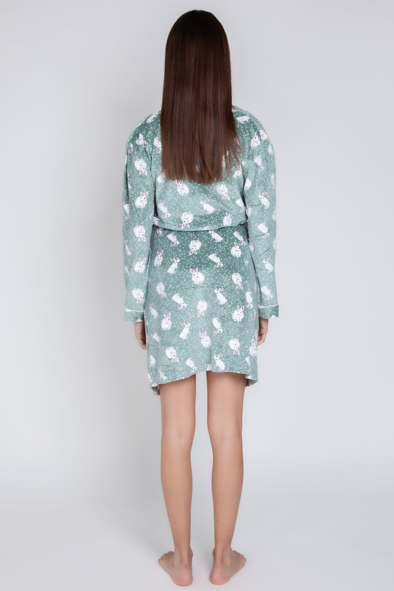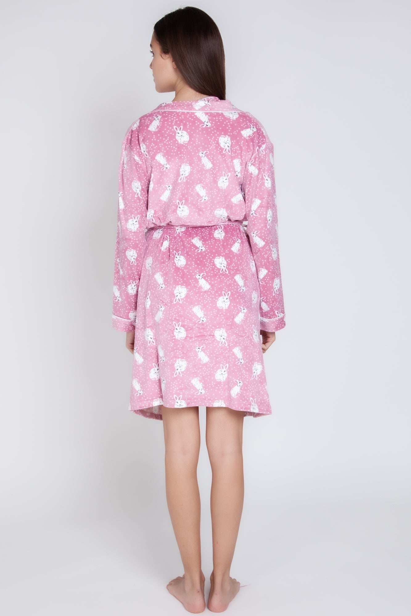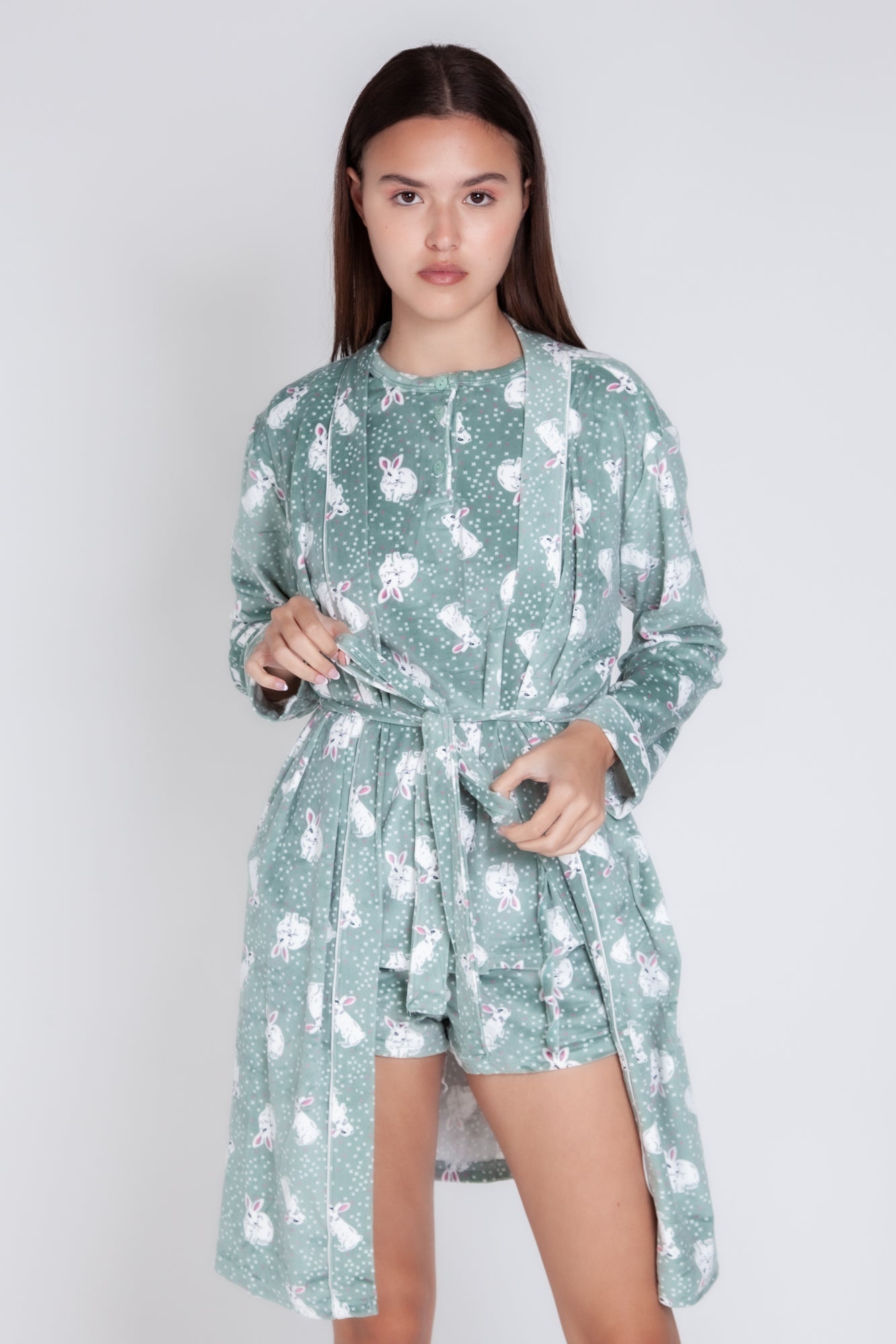 Morbido, comodo e confortevole, una texture elasticizzata e piacevole al contatto con la pelle, un tocco di praticità in più e di stile. Con questo pigiama in ciniglia blu (sfondo con pupazzi di coniglio). Le tue notti d'inverno saranno all'insegna del comfort e della serenità, con un capo perfetto per il tuo riposo ma anche da indossare per un outfit da casa nelle giornate di relax.